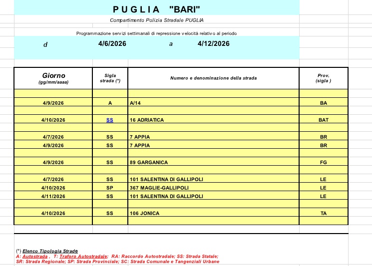 Educazione e prevenzione devono stare nella testa degli automobilisti prima che nelle palette della polizia. Per questo motivo «La Gazzetta del Mezzogiorno», d’intesa con il Compartimento Polizia stradale Puglia, anche questa settimana, pubblica l’elenco dei tratti della rete stradale pugliese dove sarà probabile incontrare una postazione di controllo delle velocità della Polstrada. In un’ottica di prevenzione, anziché aspettare che si commetta l’infrazione, è preferibile sempre farsi «vedere» per invitare l’automobilista alla prudenza e a non commettere errori.