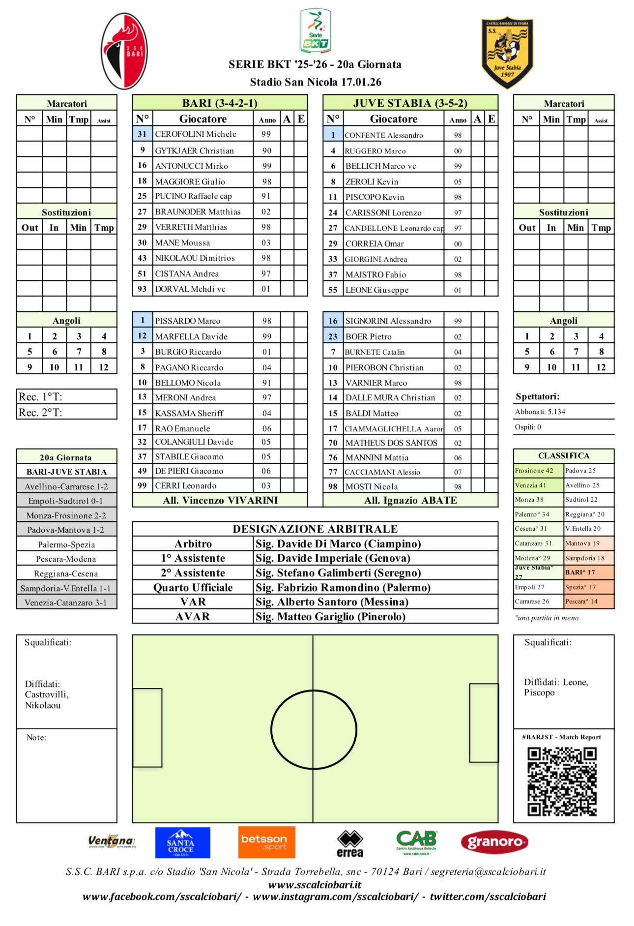 Nel posticipo del sabato della 20esima giornata di Serie B, la Juve Stabia espugna il San Nicola, superando il Bari per 1-0. Decisivo un rigore di Candellone al 37'. In classifica i campani salgono al settimo posto con 30 punti, i pugliesi restano invece penultimi a quota 17.