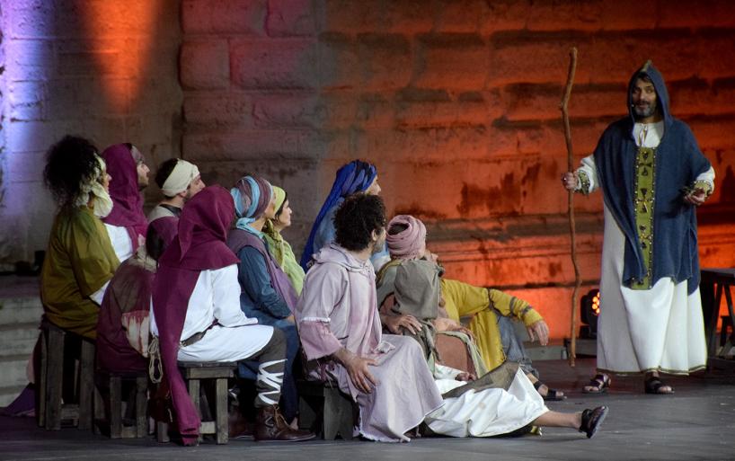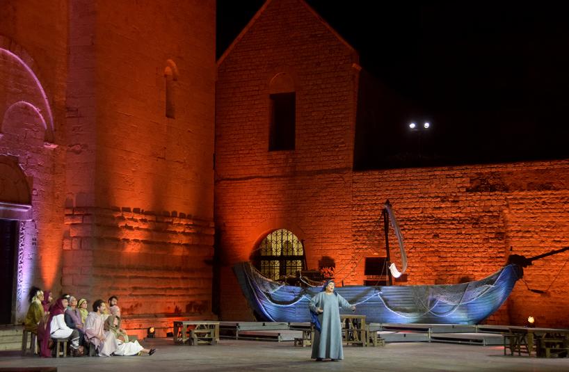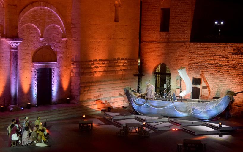 Non è un caso che sul palco compaia un’imbarcazione, simbolo della nave - chiamata impropriamente caravella dai baresi - che nel 1087 portò nel capoluogo i santi resti trafugati dalla Turchia, mentre sono una cinquantina gli orchestrali che accompagnano la rappresentazione dalle pedane installate davanti al Portico del Pellegrino. La voce affidata al popolo incoraggia i suoi sessantadue marinai mentre l’abate Elia, che accoglie le ossa del santo, ripercorre la vita e le opere del vescovo di Myra soffermandosi sui tre più famosi miracoli attribuiti al santo. Dalla scalinata della Basilica attori e i danzatori della compagnia Badathea, guidati dal regista e fondatore Nicola Valenzano, con virtuosismi ed evoluzioni celebrano il rito della traslazione delle spoglie del protettore delle fanciulle da marito, dei bambini e dei marinai, con l’adattamento di una commedia di Vito Maurogiovanni, dal titolo «Nicolaus (e venne dal mare)». Sei i quadri intervallati da musiche e coreografie, mentre le evoluzioni degli acrobati per motivi tecnici legati alla diretta tv, sono state registrate solo durante le prove.