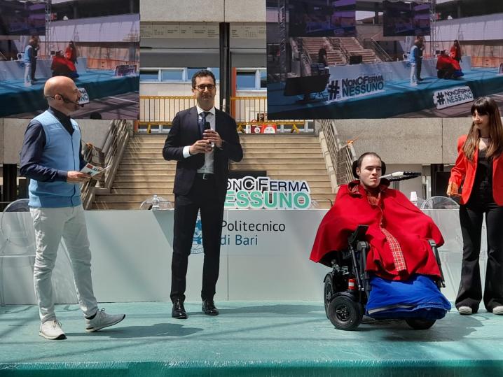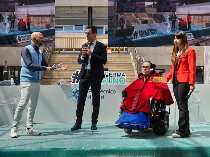 Nella seconda parte dell’evento, è stato assegnato il Premio #NonCiFermaNessuno per la miglior storia di resilienza, un riconoscimento simbolico a Giovanni Bellino, laureato al Politecnico di Bari in Ingegneria Meccanica, affetto da una grave forma di disabilità causata da una malattia. «Per il brillante percorso di studi – ha detto il rettore leggendo le motivazioni del premio – portato a termine con straordinaria forza di volontà e non comune coraggio; per le esemplari doti umane e relazionali; per le sue qualità professionali, che gli hanno consentito di vincere numerosi e prestigiosi premi».