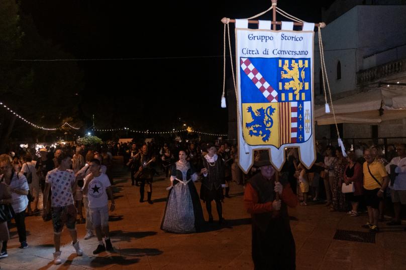 Un corteo multiepoca composto da 25 gruppi storici provenienti da tutta la Puglia e da buona parte dell’Italia, dal Lazio alle Marche, dall’Abruzzo e anche dalla Toscana con il gruppo di Torrita di Siena direttamente dallo storico Palio di fama nazionale. Ogni angolo della città antica allestita per rievocare momenti storici significativi: la Taverna Medievale con l’angolo dei Giochi Medievali in villa Garibaldi; il processo per stregoneria alla “masciara” in largo Cattedrale; l’accampamento militare dei cavalieri teutonici accanto alla Torre Poligonale del Castello e quello del XV secolo in piazza castello; e poi banchi dei mestieri antichi, sputafuochi e giocolieri. Uno spettacolo nello spettacolo per un vero tuffo nella storia che ha ammaliato i bambini e conquistato un pubblico variegato. Il momento clou dell’ultima serata, l’arrivo in piazza del Corteo Storico e l’affaccio del Conte di Conversano, al secolo Ettore Bassi, dalla balconata monumentale del Castello per il saluto ai nobili e ai popolani raccoltisi in suo onore.