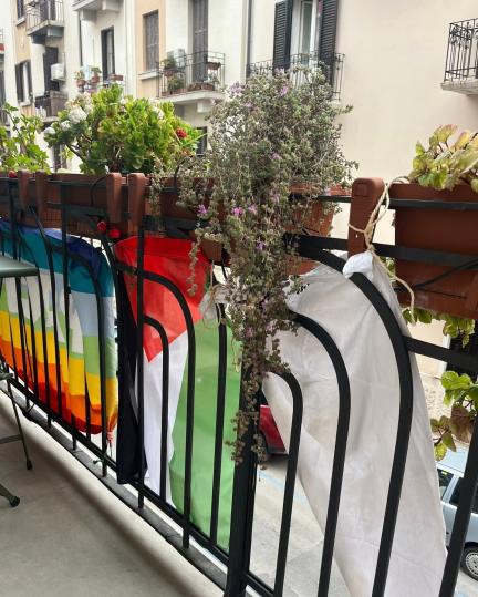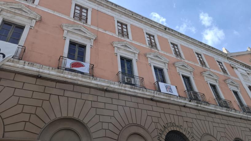 Sul lenzuolo bianco esposto sulla facciata di Palazzo di Città è dipinta un'anguria, un simbolo usato soprattutto online per esprimere solidarietà al popolo palestinese. L'anguria è un frutto che cresce nella striscia di Gaza e in Cisgiordania, e i suoi colori (rosso, verde, bianco e nero) sono anche i colori della bandiera palestinese. Anche se oggi il suo significato è noto a tutti, per decenni è rimasto un simbolo segreto della resistenza palestinese, usato soprattutto contro la censura della bandiera già dal secolo scorso. Tanto che anche oggi l'emoji dell'anguria è usata per evitare di essere penalizzati dall’algoritmo di Meta (il gruppo che possiede Instagram e Facebook), che dopo il 7 ottobre ha rallentato la circolazione di contenuti sull’attacco israeliano nella striscia di Gaza.