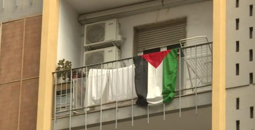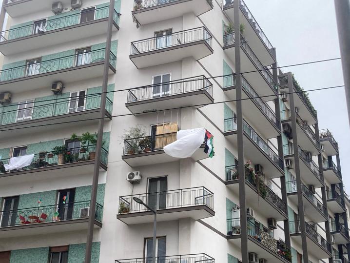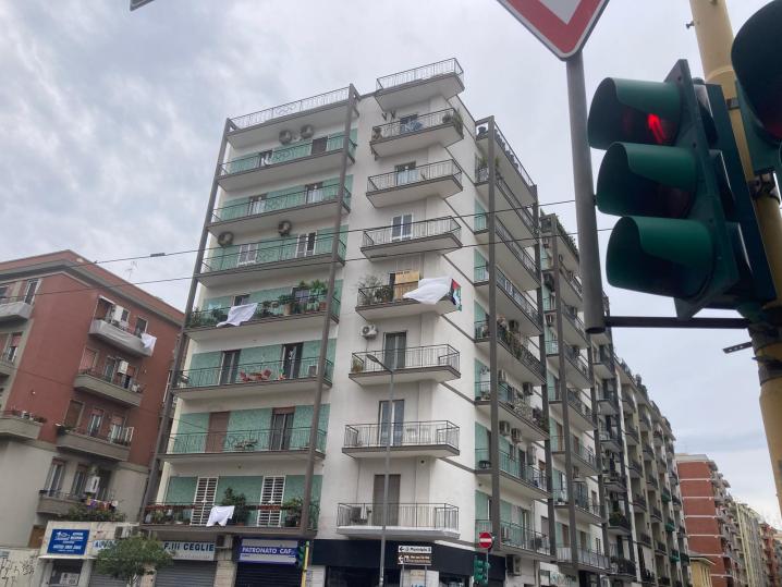 Bari, flashmob per la Palestina: tanti i balconi con bandiere e lenzuoli bianchi. Palazzo Città espone il telo con l'anguria