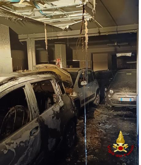 Le fiamme hanno interessato due veicoli, ma l’intero locale si è rapidamente riempito di fumo denso, rendendo necessario un lungo intervento per la completa messa in sicurezza dell’area. Per precauzione, lo stabile è stato evacuato.