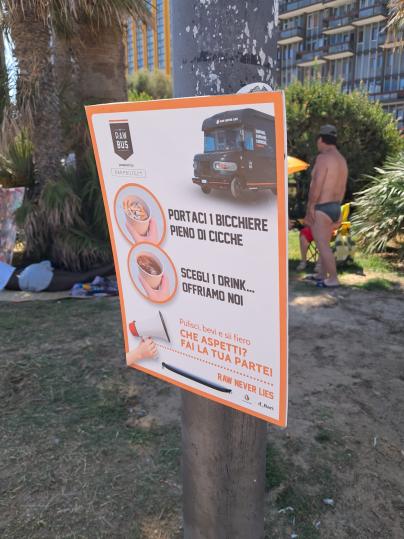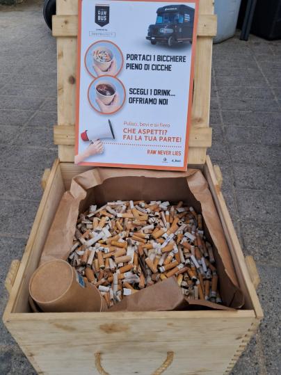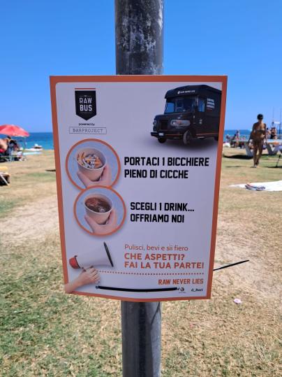 "La spiaggia non è un posacenere". Si chiama così l'iniziativa organizzata da Plastic Free Onlus sulla spiaggia di Pane e Pomodoro, a Bari, a cui sono seguiti anche i cartelli - ideati e installati da The Raw Bus e BarProject Academy - per sensibilizzare i bagnanti nel rispettare l’ambiente e mantenere pulito il litorale: chi infatti porterà al truck presente in spiaggia un bicchiere pieno di cicche di sigaretta riceverà un drink in omaggio.