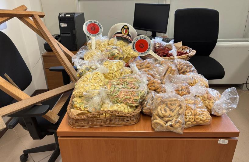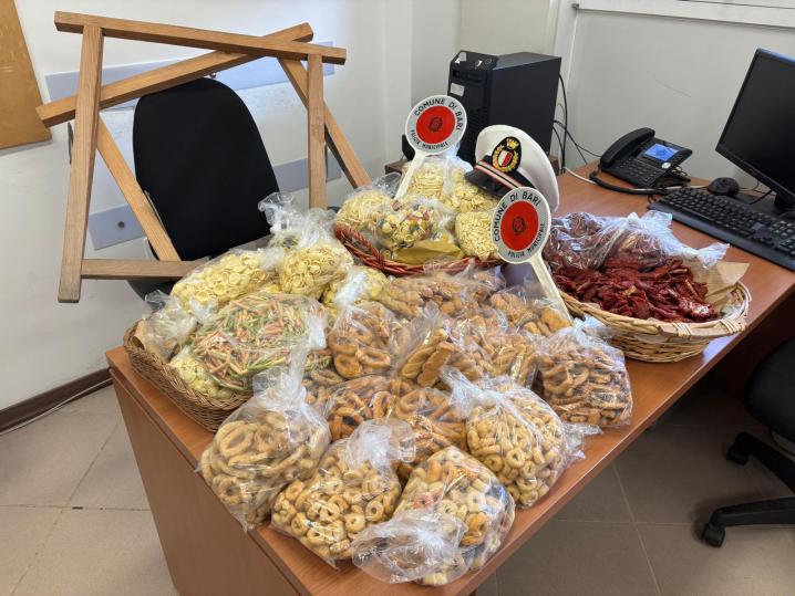 La polizia locale ha dunque elevato una sanzione amministrativa pari a 5000 euro per commercio abusivo su suolo pubblico. Il sequestro ha riguardato, nel dettaglio, dodici confezioni di taralli salati e sette di taralli dolci, ventitré di pasta secca (orecchiette e altri formati) e una cesta di pomodori secchi. Sequestrati, inoltre, i cavalletti e le basi su cui era esposta la merce.