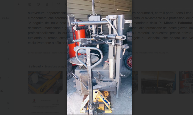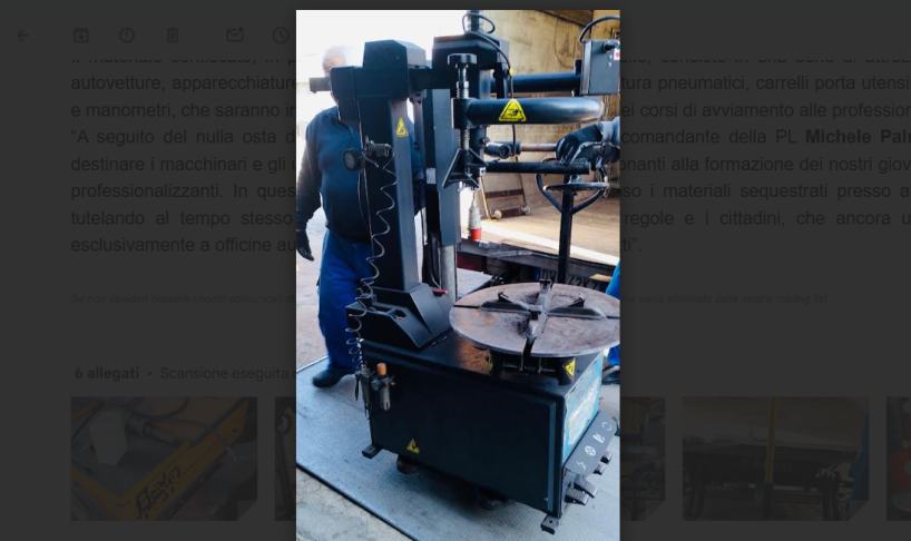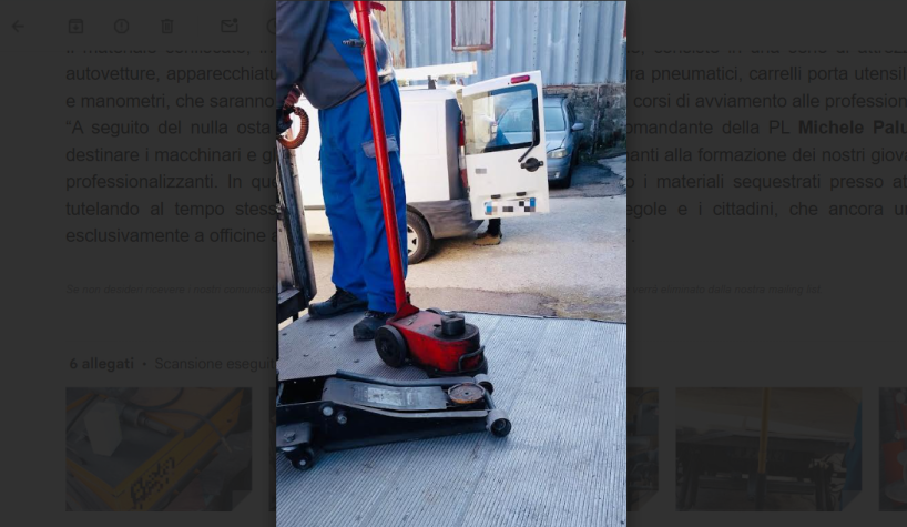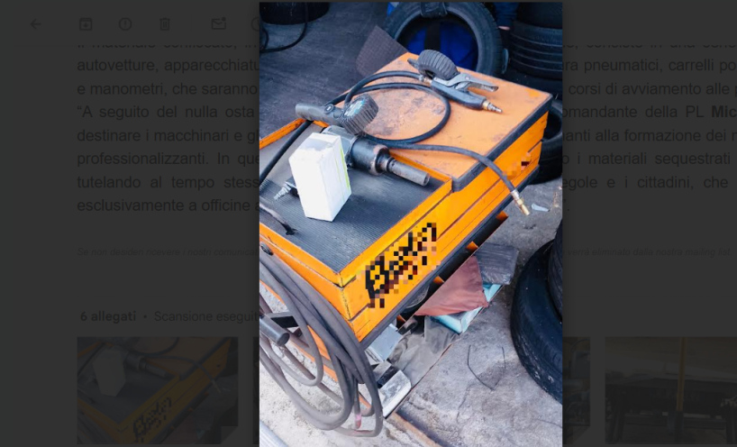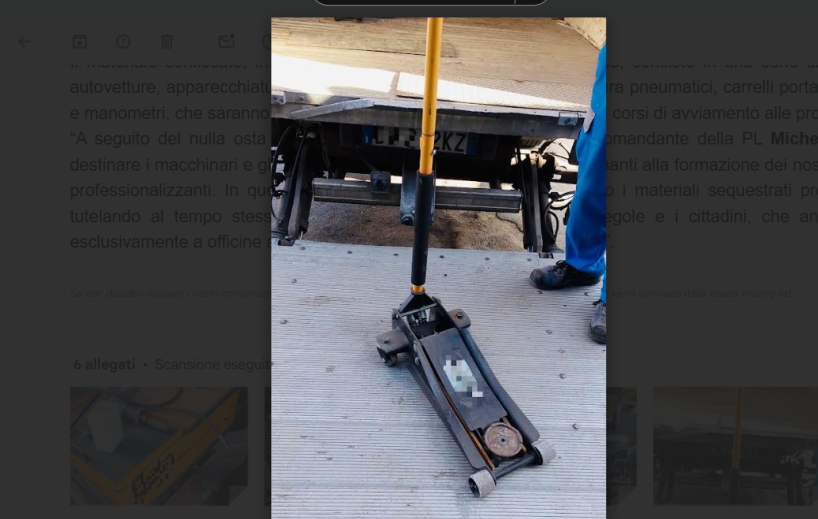 Il materiale confiscato, in perfetto stato e immediatamente utilizzabile, consiste in una serie di attrezzature tra cui figurano cric per autovetture, apparecchiature smontagomme, dispositivi per equilibratura pneumatici, carrelli porta utensili con i relativi attrezzi da lavoro e manometri, che saranno impiegati nella formazione degli studenti dei corsi di avviamento alle professioni della meccatronica.
