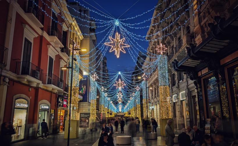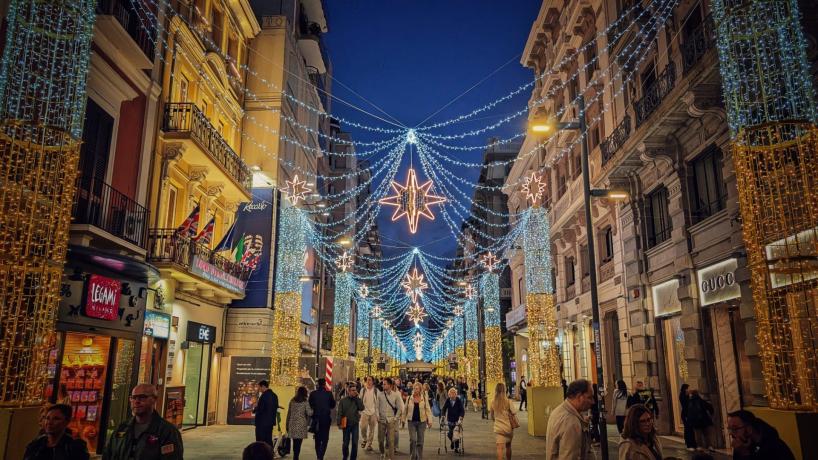 È Natale in anticipo a Bari: ieri sera cittadini e turisti, tutti con il naso all'insù, hanno assistito all'accensione delle luminarie in via Sparano. Qualche giorno fa invece si è tenuta l’accensione delle luminarie in via Argiro, dove i sei incroci principali della strada sono stati decorati con quattro pali in legno illuminati ciascuno da 400 lampadine led. E mentre in centro si vive già l'atmosfera natalizia, le alte temperature permettono comunque a molti di continuare a frequentare le spiagge baresi. Un ossimoro molto frequente di questi tempi.