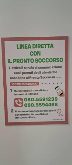 Una linea diretta tra sanitari e parenti dei pazienti in attesa. Con due numeri di telefono dedicati, è stato rafforzato il Canale di Comunicazione del Pronto Soccorso del Policlinico di Bari: lo fa sapere il Direttore sanitario Danny Sivo, che comunica anche che sono state assegnate nuove divise al personale addetto alle comunicazioni per agevolarne l'identificazione, in fase di accettazione e durante l'attesa.