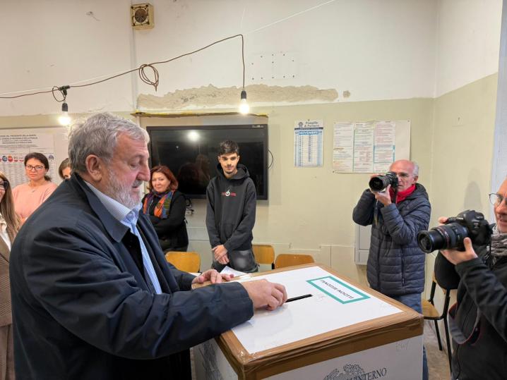 Emiliano al voto: il presidente uscente da solo al seggio nel plesso scolastico Vivante a Bari