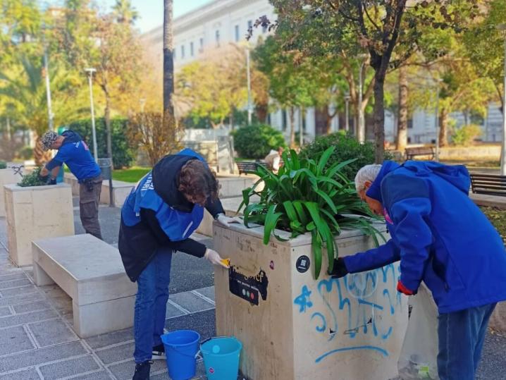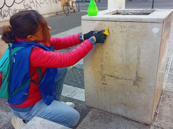 Nel corso dell’iniziativa, una ventina di volontari ha rimosso oltre un centinaio di affissioni abusive dai muri dell’area universitaria, ripulendo superfici e grandi fioriere in pietra da colla, tag e residui, e raccogliendo mozziconi e microrifiuti accumulati al loro interno. Un lavoro puntuale e faticoso che ha permesso di restituire decoro a una parte significativa della piazza, evidenziando al tempo stesso l’entità del problema.