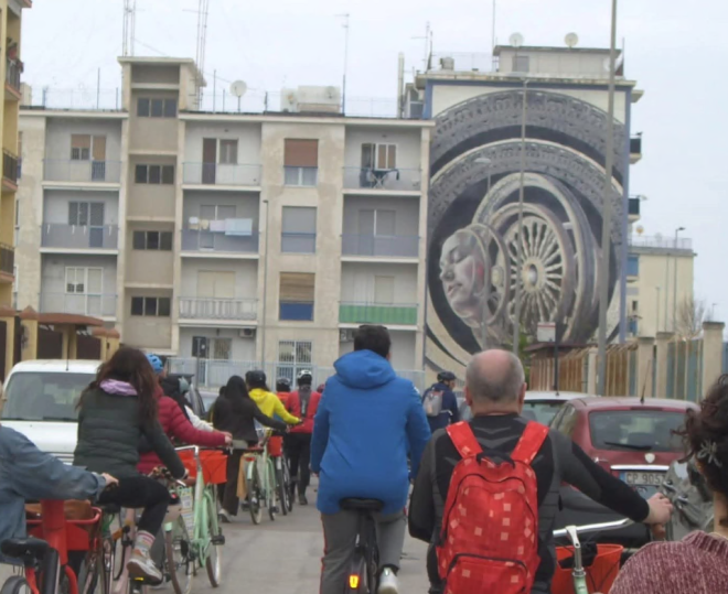 Metti una domenica in bicicletta fino al quartiere San Paolo. Non una gita ma un «circuito urbano» organizzato dalla Terreno Cycling Therapy che ha incuriosito e stupito non poco i residenti. Un gruppo di una trentina di persone partito da piazza Ferrarese e che su due ruote ha costeggiato San Girolamo, risalito strada rurale del torrente fino al quartiere, per un giro tra i tanti murales realizzati tra i palazzi.