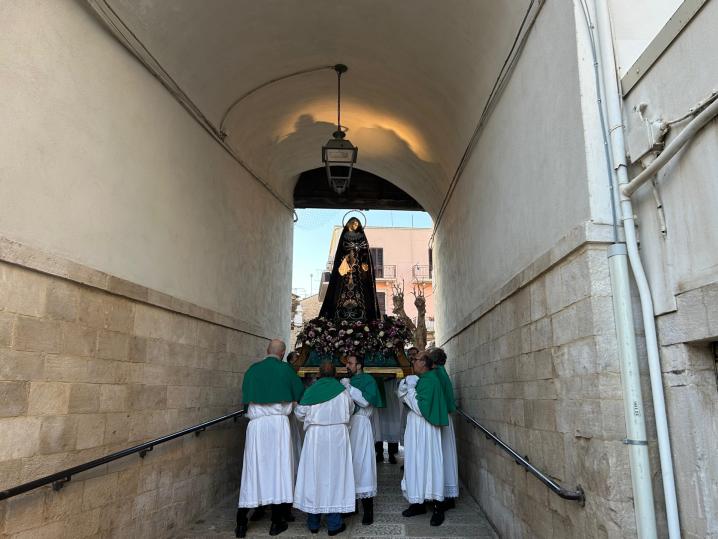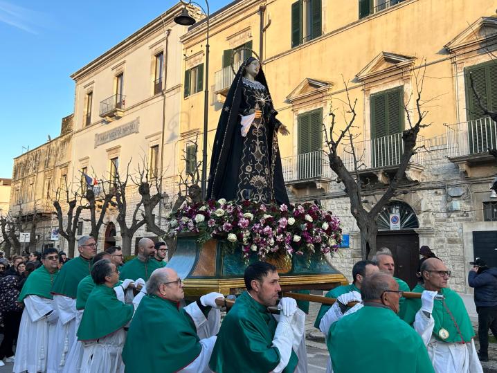 È appena iniziata la sempre sentita e seguita processione dell’Addolorata, recuperata dopo il rinvio per maltempo del Venerdì di Passione. Un momento intenso e partecipato che segna l’avvio delle celebrazioni della Settimana Santa a Terlizzi, dove fede, tradizione, cultura e arte si intrecciano in un’unica, profonda espressione identitaria.