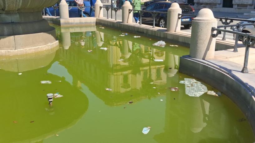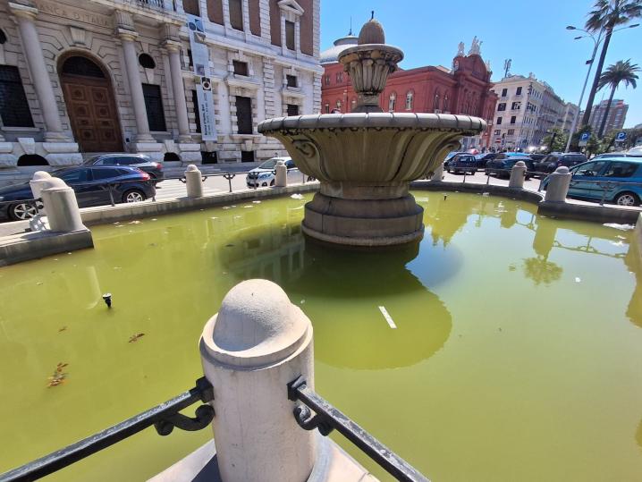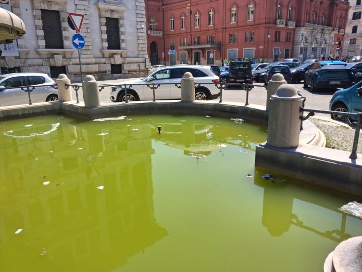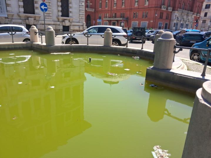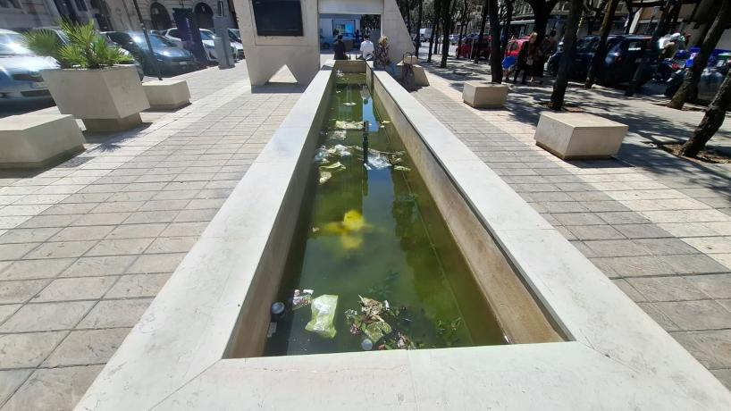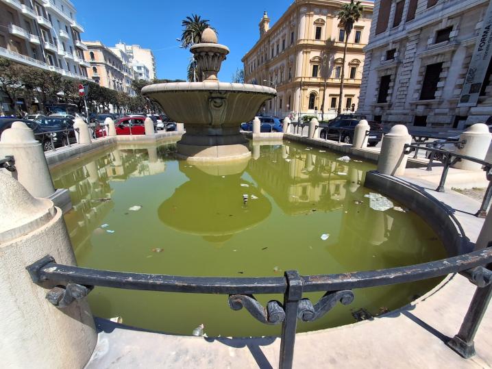 Acqua torbida, rifiuti galleggianti e impianto spento da tempo. È l’immagine poco decorosa delle fontane del centro di Bari, in particolare di quella monumentale situata nella piazzetta nei pressi del Teatro Petruzzelli, lungo Corso Cavour, uno dei luoghi più frequentati e rappresentativi della città.