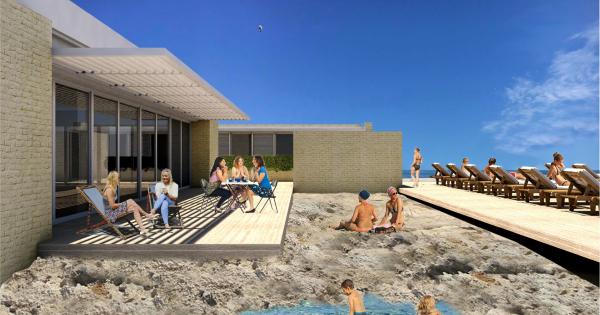 L’edifico esistente, di cui verrà conservata (e adeguata alla normativa sismica) la sola struttura portante (mantenendo la sagoma e la superfice di copertura), sarà concepito come uno spazio fluido tra interno ed esterno. Pensiline frangisole integrate con cellule fotovoltaiche schermeranno le vetrate dalle radiazioni solari, consentendo la produzione di energia per l’auto-sostentamento della struttura. I percorsi e le zattere di legno consentiranno la completa fruizione della struttura (destinata alle attività balneari) anche da parte di persone in carrozzina, essendo state previste ampie zone accessibili e raccordi tra i differenti livelli. Eventuali piccoli pontili, posti a conclusione del sistema dei percorsi, disposti in tre direzioni, consentiranno di superare in sicurezza la scogliera impervia che caratterizza il litorale, garantendo un agevole ingresso in acqua (indipendentemente dalle condizioni dei venti e delle correnti).