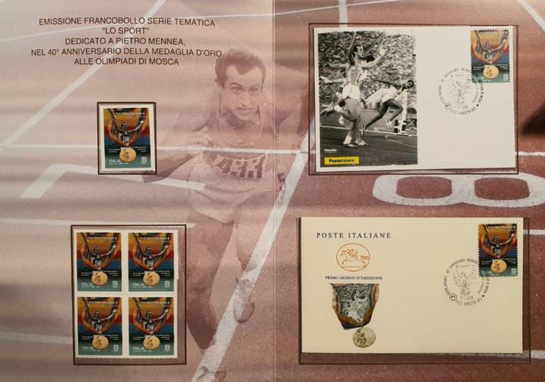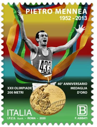 nella serie tematica “lo Sport” dedicato a Pietro Mennea, nel 40esimo anniversario della medaglia d’oro alle Olimpiadi di Mosca, relativo al valore della tariffa B paria 1,10 euro. Tiratura: quattrocentomila esemplari. Foglio da quarantacinque esemplari.
