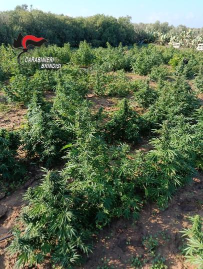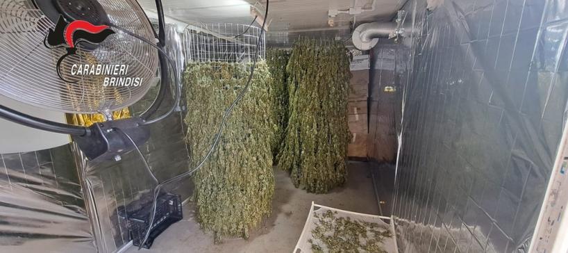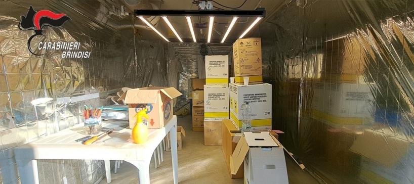 Una maxi piantagione di marijuana è stata scoperta dai carabinieri a Brindisi nel giardino dell'abitazione di una coppia in campagna in località Apani. Entrambi arrestati. Lui ha 52 anni, lei 56. Devono rispondere del reato di produzione e detenzione illecita di sostanze stupefacenti ai fini di spaccio. Sono state recuperate 540 piante di marijuana interrate nel giardino dell’abitazione. E poi 27 scatoloni di cartone occultati in due container contenenti infiorescenze di marijuana, per un totale di 30 chilogrammi; 13 kg di marijuana già confezionati in vari contenitori; vario materiale per la coltivazione e lavorazione della marijuana, tra cui ventilatori, deumidificatori, lampade di ultima generazione per stimolare e sviluppare la crescita delle piante, essiccatori, una bilancia elettronica di precisione e buste di varie dimensioni per il confezionamento e la pesatura della sostanza; tute da lavoro dotate di maschera e filtro, con tutta evidenza utilizzate dagli indagati nelle operazioni di coltivazione della marijuana.