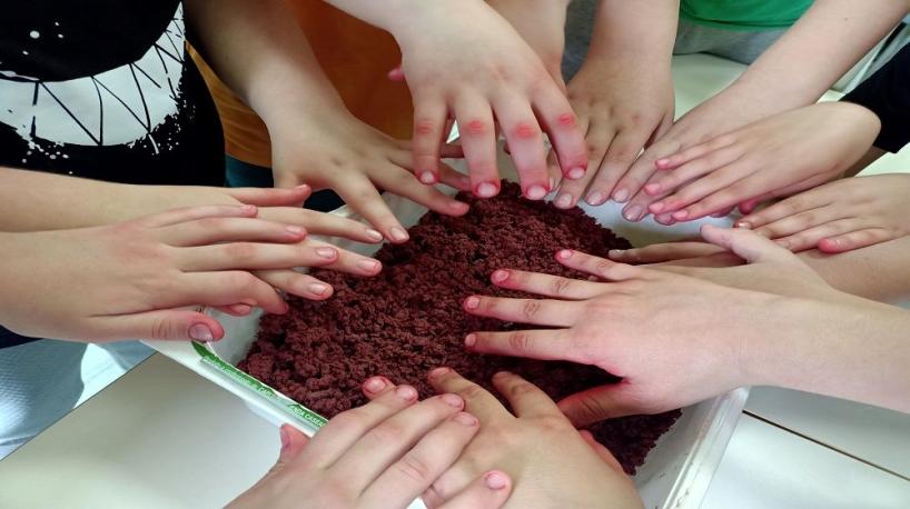 Abbiamo inserito la nostra polpa colorata nello stampino. Abbiamo distribuito sul fondo della forma il composto.