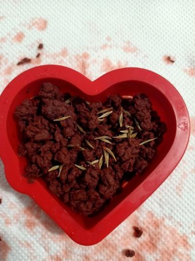 Per completare i cuori, abbiamo ricoperto i semi con altra polpa di carta fino a riempire tutta la forma di cuore.