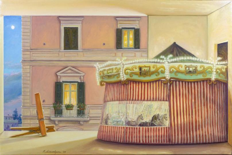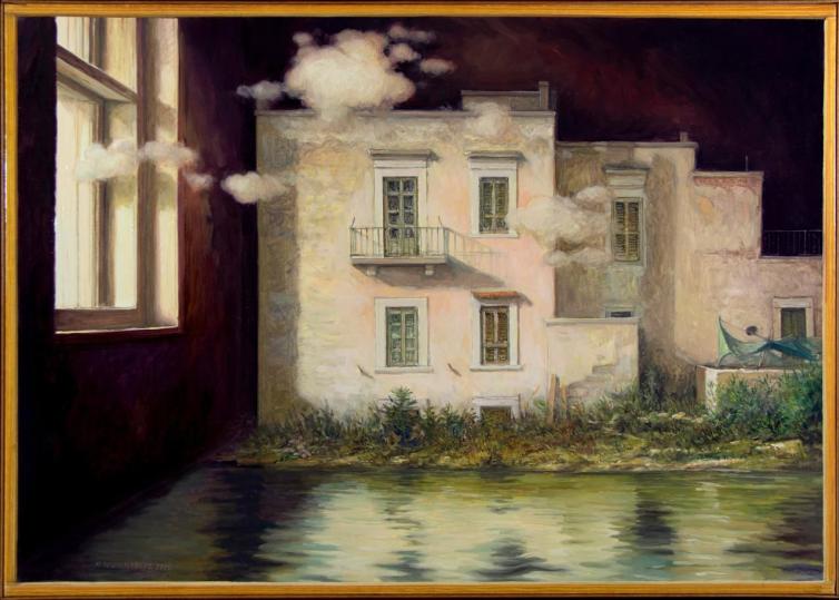 L’artista pugliese, difatti, agisce nelle sue tele sulla soglia di uno spiraglio – a mano a mano facentesi squarcio geometrico – che vede coinvolti, in uno scambio senza fine, architetture vicine o lontane e scorci naturali, il dominio del reale e la dimensione intima e simbolica dell’autore; l’auspicio del quale è che l’osservatore possa – in questo scavalcarsi continuo e vicendevole tra materia e ciò che materia non è – abbandonarsi, dunque ritrovarsi nel dettaglio di una comune percezione. Un gioco figurativo, questo dello scenografo e pittore classe ’55, i cui precedenti illustri sono riscontrabili nella metafisica «dechirichiana» di ascendenze rinascimentali e nel gioco di correlazione oggettiva della stessa, nel surrealismo paradossale e profetico di Magritte, nel primo e «novecenteschissimo» Sironi del razionalismo – già ripreso da Paolo Ventura qualche tempo fa per i fondali delle proprie narrazioni fotografiche – così come nelle dimensioni volutamente scombussolate, sperequate caratterizzanti la pittura magico-realistica di Gianfilippo Usellini.