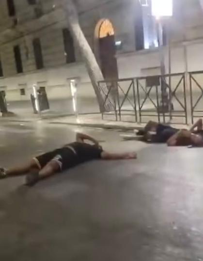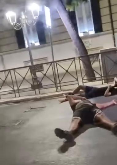 Follia a Foggia, uomini stesi in strada in pieno centro: le auto costrette a fare slalom per non investirli FOTO