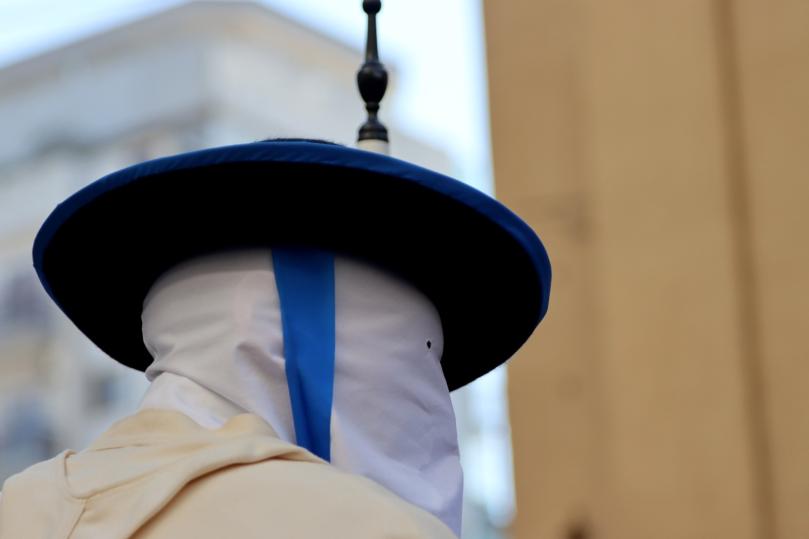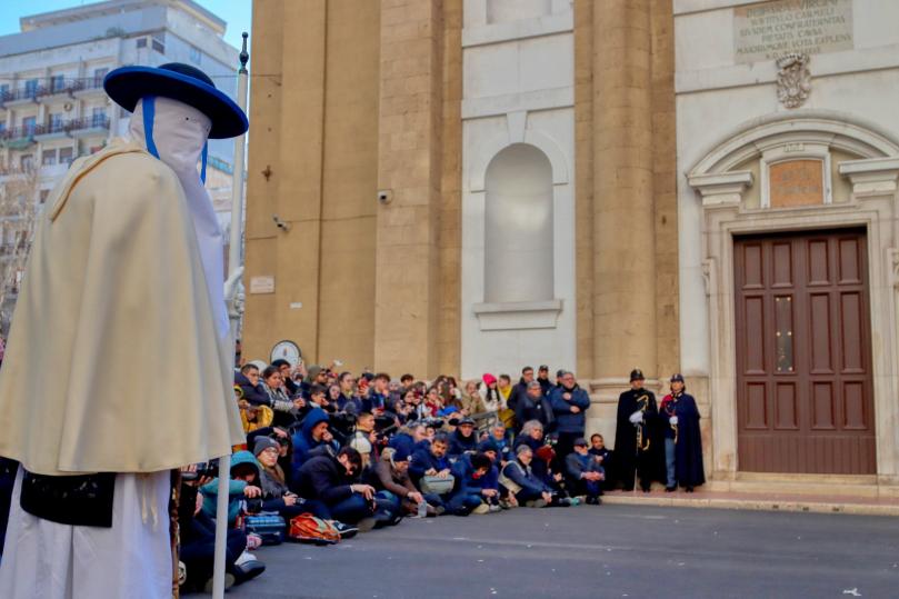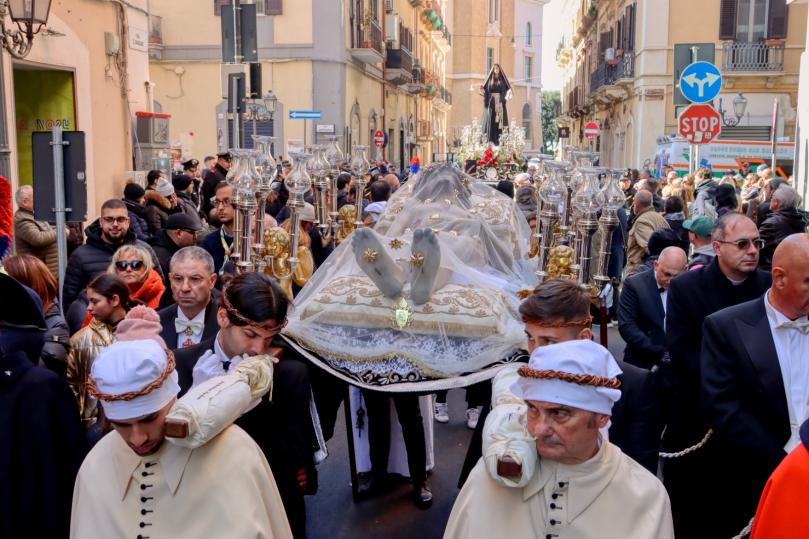 Di fronte al lento incedere dei confratelli, sguardi assorti, incuriositi, a volte increduli, ma anche silenzio, preghiera, raccoglimento. Verso sera l’arrivo dell’arcivescovo Filippo Santoro per il discorso alla città e ai confratelli dalla loggia del Carmine (di cui si riporta il contenuto in altro articolo di questa pagina). Il triduo oggi si chiude con il rientro dei Misteri. C’è solo un rumore che si attende e che si vuole sentire chiaro, perché è il felice e tradizionale compimento dei Riti, e sono i tre colpi di mazza che il troccolante batte sul portone della chiesa che a quel punto si spalanca.
