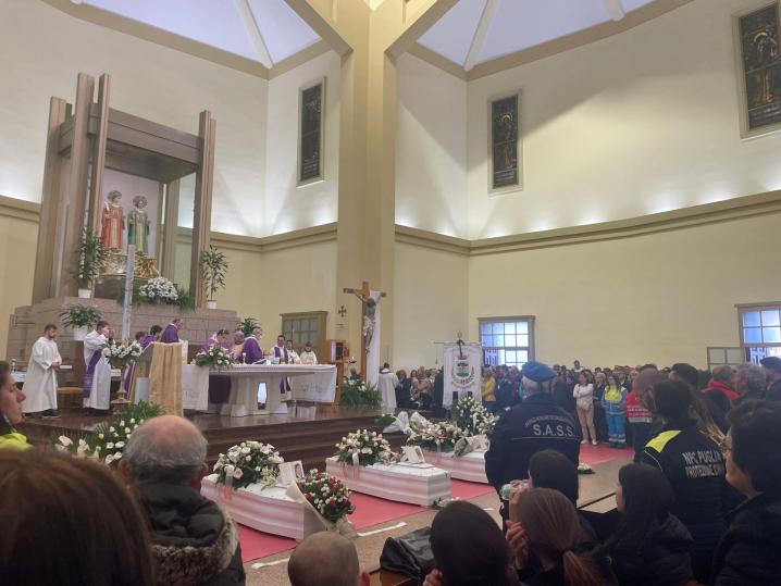 Lo ha detto l’arcivescovo di Bari-Bitonto, Giuseppe Satriano, nell’omelia ai funerali - in corso nella Basilica dei Santi Medici di Bitonto - dei quattro ragazzi morti la sera del 25 aprile in un incidente stradale sulla provinciale 231. «Siamo distrutti e affranti- ha proseguito il vescovo - è come se in quell'incidente fosse morto ciascuno di noi. Il sogno d’amore di giovani fidanzati e i desideri di vita di ognuno di loro si sono infranti, annullando un futuro pieno di speranza. Altri due nostri figli stanno combattendo battaglia della vita, e noi siamo qui per accompagnarli in preghiera in questi giorni», ha detto riferendo agli altri due giovani rimasti feriti nell’incidente. Lunghi applausi hanno accompagnato la fine dell’omelia.