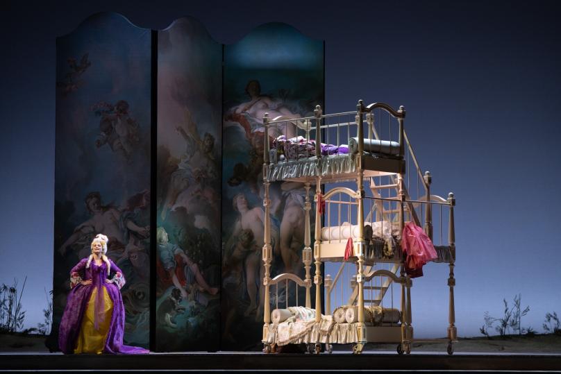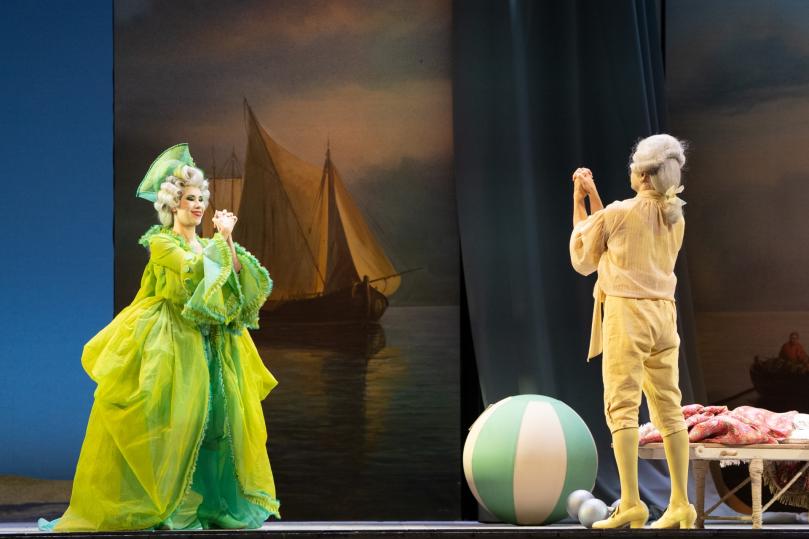 Al Petruzzelli, dove è l’energica appassionata direzione orchestrale di Montanari a coordinare l’ ottimo cast canoro, la Villeggiatura sentimental-musicale della Cecchina si connota di note ironiche, di sprezzature a tratti sarcastiche, con qualche ghiribizzo registico, ma poi tutto si tiene con cordiale bonomia accomodante. Il Marchese è un po’ un fatuo tontolone, che ama Cecchina ma non trascura le altre servette, fra un calice di rosolio e l’altro, specie in combutta col Soldato tedesco, sapido Buffo da Commedia dell’Arte. La scena si evolve da pic-nic con sdraio, ombrelloni, attrezzi sportivi, carrelli di bibite e «cioccolatte», verso citazioni da Bibiena con colonnati un po’ sbrecciati o con paraventi e fondali da Boucher e Fragonard, o con Cieli pieni di nuvoloni assai barocchi. Scena attraversata anche dal Marchese su monopattino, saettante e cantante (e divertente).