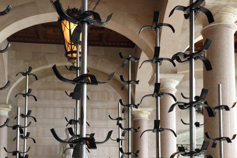 L’installazione assume la forma di un dispositivo meccanico: sedici aste verticali in ferro sorreggono dischi metallici e zappette forgiate in ceramica, evocando macchine agricole e strumenti di lavoro quotidiano. La scelta formale evidenzia la condizione dei corpi sfruttati, insieme produttivi e vulnerabili, ridotti a ingranaggi di un sistema economico che ne consuma le energie. Le stele, in numero pari alle lavoratrici coinvolte, raggiungono un’altezza doppia rispetto alla loro statura reale: un’inversione simbolica della prospettiva abituale che restituisce visibilità e centralità a soggetti storicamente marginalizzati.