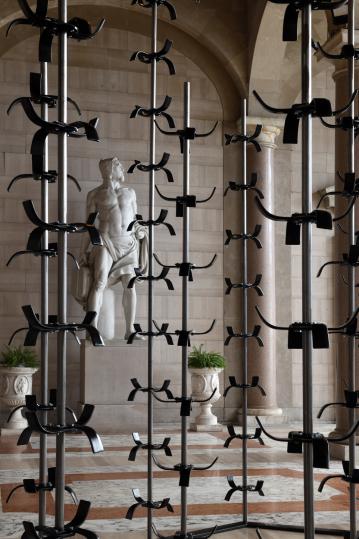 La scelta di esporre l’opera nel salone di rappresentanza dell’ente metropolitano crea un dialogo significativo con l’architettura e con la collezione della Pinacoteca Metropolitana Corrado Giaquinto. Da un lato, l’installazione si confronta con le monumentali sculture di Giulio Cozzoli (Il Marinaio e L’Agricoltore, 1936-1937) presenti nella sala del Colonnato; dall’altro, instaura un dialogo con opere della Pinacoteca dedicate al tema della terra e del lavoro, tra cui Il riposo (1875) di Raffaele Belliazzi, Contadina senese che fa l’erba (1880-1890) di Giovanni Fattori, La raccolta delle olive (1862-1865) di Telemaco Signorini, 9 mq di pozzanghere (1967) di Pino Pascali e gli Abiti mentali (anni ’70) di Franca Maranò.
