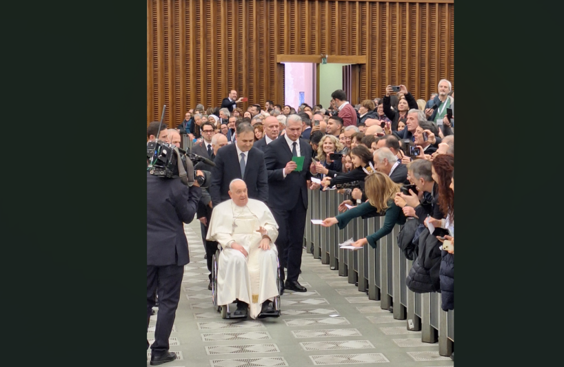 Il Pontefice, giunto nell’Aula Paolo VI a chiusura dell’ incontro moderato da Mario Calabresi, cui sono intervenuti sui temi del rapporto tra comunicazione e democrazia, applauditissimi, la giornalista filippino-statunitense Maria Ressa, Nobel per la Pace nel 2021, e lo scrittore irlandese-statunitense Colum McCann, non legge il suo discorso e lo fa consegnare, dilungandosi però poi nei saluti personali e nelle strette di mano ai presenti. Numerosa la rappresentanza del giornalismo pugliese, a cominciare dalla delegazione dell'Ucsi Puglia.