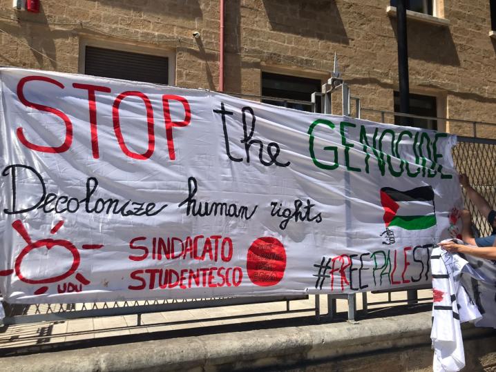 'Stop the genocidè e l’haastag #freepalestine sono le scritte che compaiono su uno striscione affisso a Lecce lungo l’area dell’arrivo della quarta del Giro d’Italia e firmato dal sindacato studentesco Udu. Non l’unico striscione ben visibile in via Calasso dove si concluderà nel pomeriggio la corsa in rosa partita stamattina da Alberobello. A poca distanza l’altra rivendicazione di Amnesty International Lecce: 'Senza Gaza l’Europa muore stop genocidio.