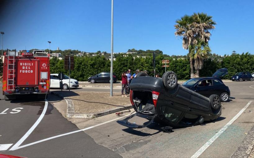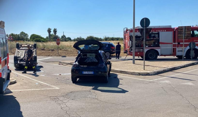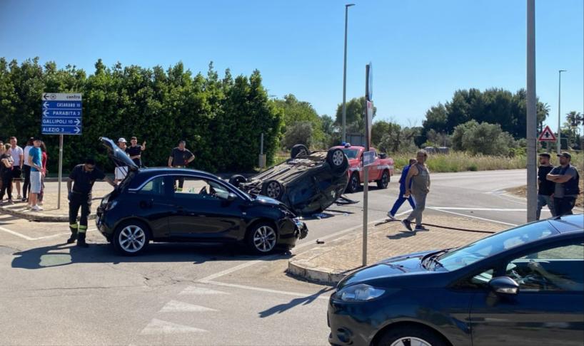 TUGLIE - Scontro violento tra due auto all'ingresso di Tuglie nel Salento: una dopo l'impatto si ribalta. Feriti i due conducenti delle vetture che sono stati trasportati in ospedale a Gallipoli. Ancora da chiarire la dinamica dell'incidente: sul posto sono accorsi i vigili del fuoco di Gallipoli per mettere in sicurezza l'area, i carabinieri e il 118.