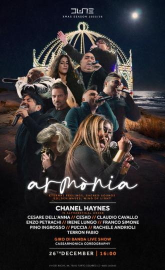 La direzione artistica è affidata a Cesare Dell’Anna, che anche quest’anno ha costruito un racconto musicale corale, fondato sull’incontro tra voci, stili e storie diverse, con al centro l’idea di comunità. Come da tradizione, Armonia ospita un artista speciale che sceglie di partecipare per affinità e condivisione: dopo Tonino Carotone e Albano Carrisi, l’edizione di quest’anno vede la partecipazione straordinaria di Chanel Haynes, artista internazionale dalla voce potente ed elegante, nota per la sua collaborazione dal vivo con i Rolling Stones.