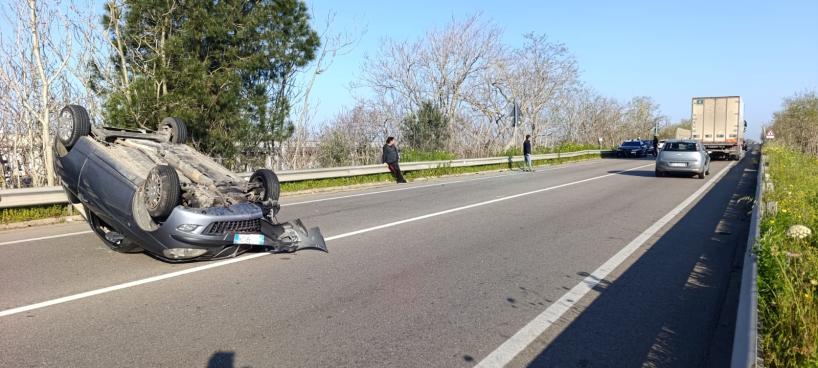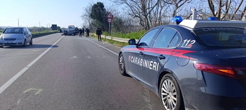 L'impatto violento tra una Lancia Musa e una Lancia Y ha portato al ribaltamento di una delle due vetture. Sul posto i carabinieri per i rilievi del caso