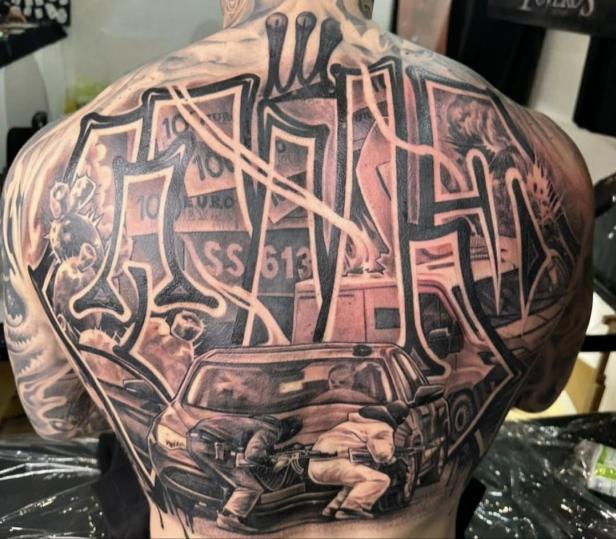 Un tatuaggio a tutta schiena che riprende senza fraintendimenti i momenti clou dell’assalto ai portavalori sulla Lecce-Brindisi del 9 febbraio scorso, a seguito del quale è rimasto ferito un carabiniere.