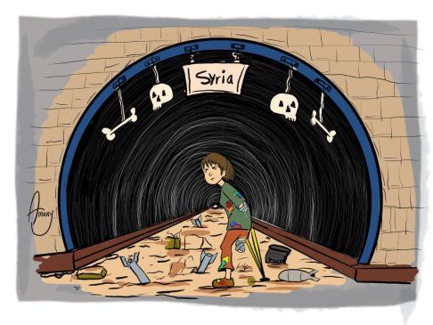 «Ho tratto il titolo della mostra dalla storia di un bambino che ha perso una gamba a causa di un missile russo caduto sulla sua casa», spiega Amany al-Ali. «Ogni disegno fa luce su un problema differente di cui soffrono i siriani sia nelle aree liberate sia nelle zone controllate dal regime».