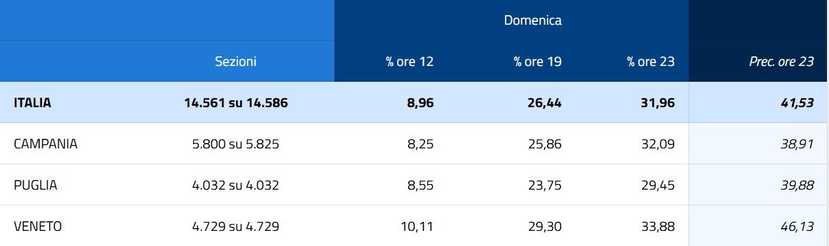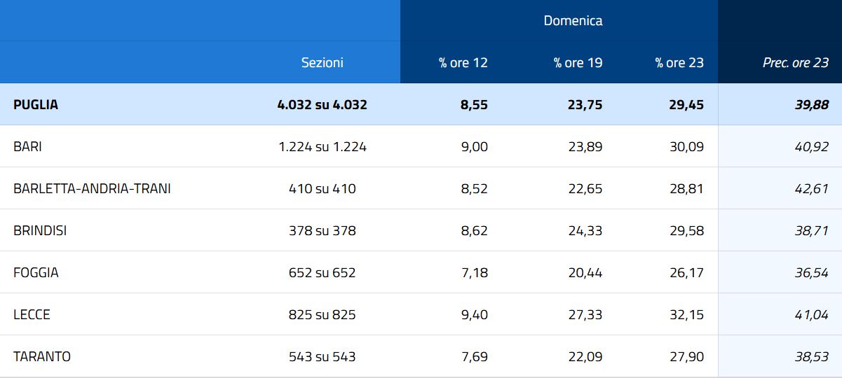 Il primo giorno di voto in Puglia si è chiuso con un calo dell'affluenza di dieci punti rispetto al 2020: alle ore 23 di ieri ha votato il 29,45% degli aventi diritto rispetto al 39,88% della precedente tornata elettorale, quando si votò in piena emergenza Covid e con le mascherine. Alle 19 l'affluenza era ferma al 23,76. Andando per province, a Bari si registra una percentuale del 30,09%, su 1224 sezioni; Lecce, seconda in Puglia con 825 seggi, incontra una percentuale del 32,15%. Procedendo si registrano il 20,44% a Foggia (652 sezioni), il 27,81% a Taranto (543 seggi), il 28,81% nella Bat (410 sezioni) e il 29,46% a Brindisi (378 seggi). Cinque anni fa Michele Emiliano, candidato del centrosinistra, raccolse il 46,78 per cento dei consensi contro il 38,93 per cento di Raffaele Fitto, candidato del centrodestra. Alle urne si recò il 56,43 per cento degli elettori, un'affluenza più alta e in controtendenza rispetto al 2015 (quando fu il 51,16 per cento).