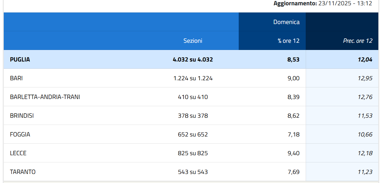 In Puglia alle ore 12 di domenica 23 novembre l'affluenza registrata alle urne è in calo rispetto alle ultime elezioni regionali (4032 sezioni in tutto) con l'8,53%. Andando per province, a Bari si registra una percentuale del 9,00%, su 1224 sezioni; Lecce, seconda in Puglia con 825 seggi, incontra una percentuale del 9,40%. Procedendo si registrano il 7,18% a Foggia (652 sezioni), il 7,69% a Taranto (543 seggi), l'8,39% nella Bat (410 sezioni) e l'8,62% a Brindisi (378 seggi). Cinque anni fa Michele Emiliano, candidato del centrosinistra, raccolse il 46,78 per cento dei consensi contro il 38,93 per cento di Raffaele Fitto, candidato del centrodestra. Alle urne si recò il 56,43 per cento degli elettori, un'affluenza più alta e in controtendenza rispetto al 2015 (quando fu il 51,16 per cento).