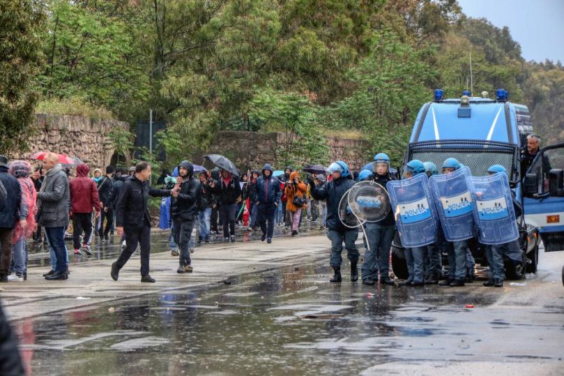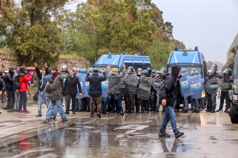 TARANTO - Al passaggio del corteo ambientalista davanti all’Ilva alcune persone dei circa mille manifestanti hanno lanciato sassi e bottiglie di vetro vuote contro i poliziotti che presidiano la zona (foto Ansa), senza colpirli. Un’azione che è stata stigmatizzata da altri partecipanti alla marcia organizzata da cittadini e movimenti. Secondo i manifestanti, «la provocazione è quella del governo che viene a Taranto con 5 ministri e pensa di prenderci in giro. Basta, si raccontano bugie. Non ci fidiamo dei ministri».