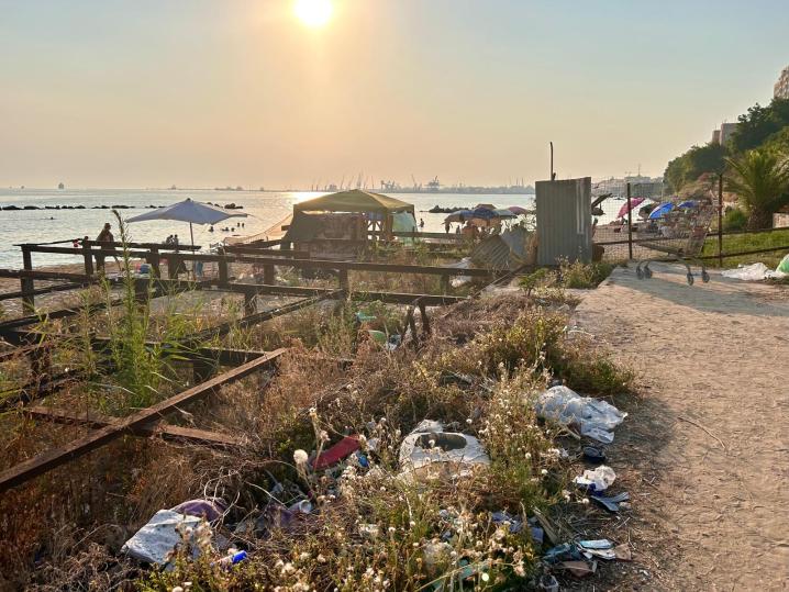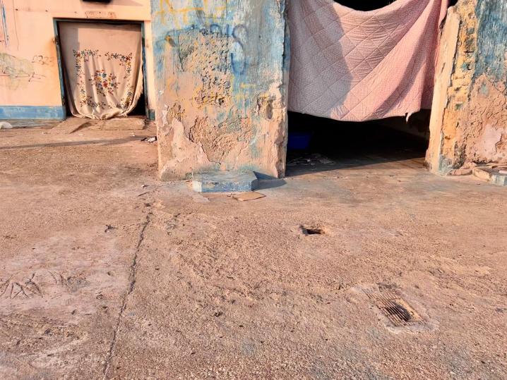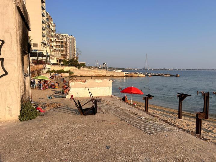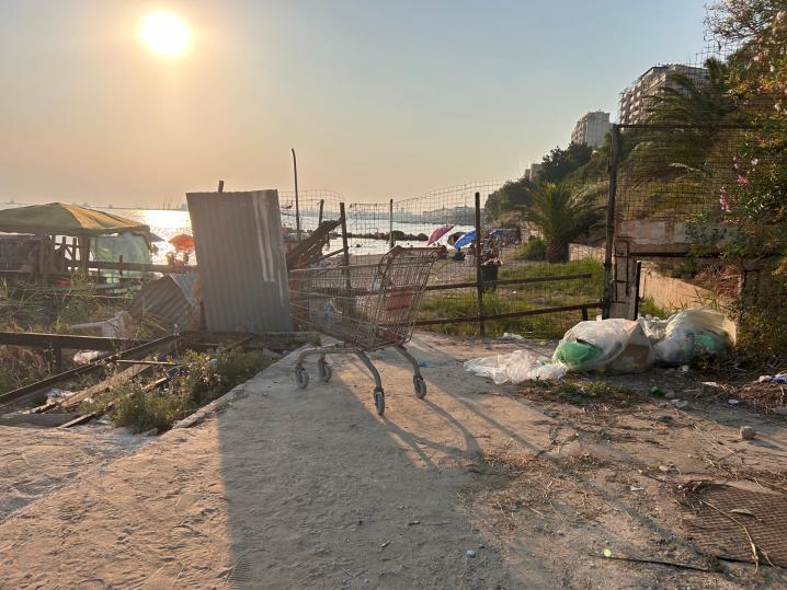 Scendendo dalla scaletta di ferro poco prima del ristorante Nautilus, all’altezza di via Cavallotti e via Nitti, ci si trova davanti un cancello azzurro, sovrastato da piante rampicanti e fichi. Subito si avverte un forte odore e ci si rende conto che la spazzatura è ovunque. Bottiglie di plastica e di vetro, sacchetti, pacchi di patatine e confezioni di cibo d’asporto, sono ficcati in ogni angolo, ogni piccolo anfratto. Appena scesi ci si ritrova nel vecchio stabilimento balneare che conserva i suoi colori, bianco e azzurro. L’edificio della biglietteria, il bar e le cabine, oggi sono un rifugio per migranti e senza tetto, che qui hanno creato degli accampamenti di fortuna. Le vecchie cabine sono piene di spazzatura, materassi, brandine, coperte, scarpe e vestiti, siringhe, piatti di plastica, graffiti e tutto ciò che racconta il passaggio dell’uomo.