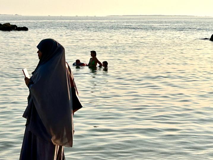 Tre migranti al tramonto prendono il fresco sotto un fico, in riva al mare seduti su una sdraio, in mezzo a un cumulo di rifiuti che spostano a mani nude per farsi spazio.