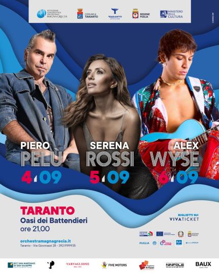 «Festival pop e sinfonico - ha spiegato il direttore artistico Piero Romano - due generi che si fondono e diventano MediTa: mi piace pensarlo come una ventata di ottimismo, un esempio di energia positiva per la nostra città, la nostra storia. Piero Pelù, che si esibirà il 4 settembre, è una passione che coltivavamo da tempo: sarà una serata speciale con la fusione tra l’Orchestra della Magna Grecia e l’Orchestra Jazz Siciliana diretta da Domenico Riina. Serena Rossi (5 settembre) la conosciamo come grande attrice ma anche come bravissima interprete di una melodia famosa in tutto il mondo; poi Alex Wyse: messosi in luce al Festival di Sanremo fra le Nuove proposte, è stato ospite del Museo Archeologico nazionale di Taranto in occasione della rassegna Musica Fluida, ottenendo un successo clamoroso».