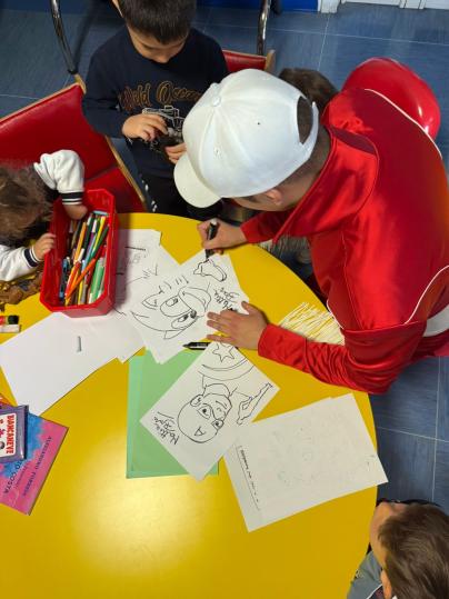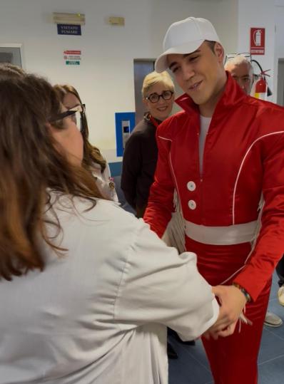 Vestito con la sua iconica tuta rossa, l’artista tarantino, oggi residente a New York, ha disegnato e creato insieme ai bambini, trasformando per qualche ora gli spazi ospedalieri in un laboratorio di colori e sorrisi. L’iniziativa, promossa dall’associazione Simba ODV in collaborazione con il vicesindaco Mattia Giorno, rientra nel più ampio impegno volto all’umanizzazione delle cure.