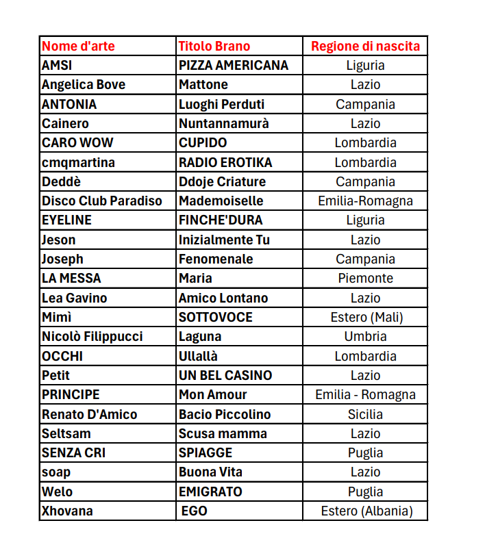 Dopo le audizioni dal vivo nella storica Sala A di Via Asiago a Roma, i finalisti si sfideranno in cinque appuntamenti su Rai 2, Radio2 e RaiPlay a partire da martedì 11 novembre, con la conduzione di Gianluca Gazzoli. Solo due artisti, al termine del percorso, conquisteranno il pass per la sezione Nuove Proposte del prossimo Festival di Sanremo 2026.