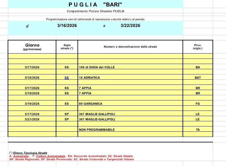Educazione e prevenzione devono stare nella testa degli automobilisti prima che nelle palette della polizia. Per questo motivo «La Gazzetta del Mezzogiorno», d’intesa con il Compartimento Polizia stradale Puglia, anche questa settimana, pubblica l’elenco dei tratti della rete stradale pugliese dove sarà probabile incontrare una postazione di controllo delle velocità della Polstrada. In un’ottica di prevenzione, anziché aspettare che si commetta l’infrazione, è preferibile sempre farsi «vedere» per invitare l’automobilista alla prudenza e a non commettere errori.