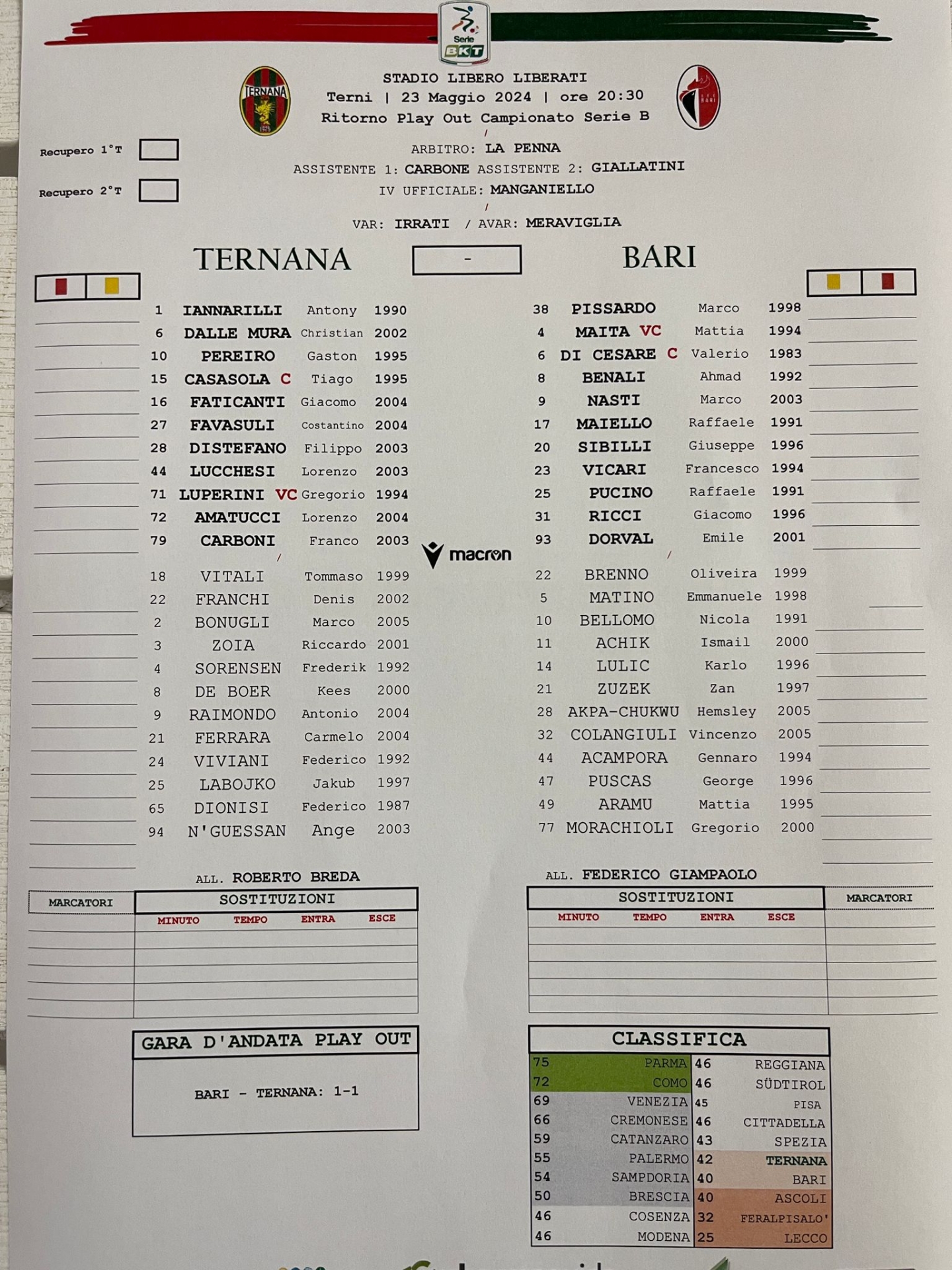 Se Ternana e Bari pareggiano nel match di ritorno del 23 maggio 2024, la Ternana è salva e il Bari è in Serie C.