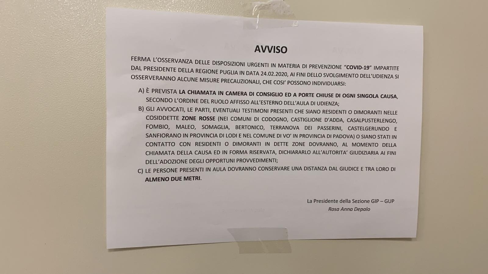 BARI - Effetti del Coronavirus nel tribunale di Bari. L’udienza odierna si svolge con le finestre aperte e con il giudice Angelica Passarella che indossa la mascherina, e che ha imposto alle parti (avvocati e imputati) di rimanere “ad almeno due metri” e di aspettare il proprio turno nei corridoi. In altre aule, i giudici hanno chiesto di evitare assembramenti. Diversi gli avvocati in protesta. Intanto scattano le misure precauzionali: udienze a porte chiuse e distanza di almeno due metri tra le persone in aula: sono solo alcuni dei punti scritti nell'avviso per le udienze preliminari e i processi con rito abbreviato, nell’ambito delle "disposizioni urgenti in materia di prevenzione 'Covid-19' impartite dal presidente della Regione Puglia». L’avviso, a firma della presidente della sezione Gip-Gup, Rosa Anna Depalo, è affisso nel Palagiustizia di via Dioguardi: prevede «la chiamata in camera di consiglio e a porte chiuse di ogni singola causa, secondo l’ordine del ruolo affisso all’esterno dell’aula di udienza», che «gli avvocati, le parti, eventuali testimoni presenti che siano residenti o dimoranti nelle cosiddette 'zone rossè (nei Comuni Codogno, Castiglione d’Adda, Castelgerundo e Sanfiorano in provincia di Lodi e nel Comune di Vò in provincia di Padova) o siano stati in contatto con residenti o dimoranti in dette zone dovranno, al momento della chiamata della causa e in forma riservata, dichiararlo all’autorità giudiziaria».