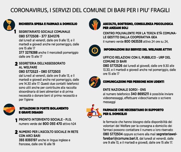 - la segreteria dell’assessorato al Welfare dal lunedì al venerdì, dalle ore 9 alle 13, e il martedì e giovedì anche nel pomeriggio, dalle ore 14.30 alle 17 (080 5772523; 080 5772503). Questi due contatti telefonici sono utili anche per contribuire alla raccolta straordinaria di beni alimentari e di prima necessità o donare beni di prima necessità e per l’igiene