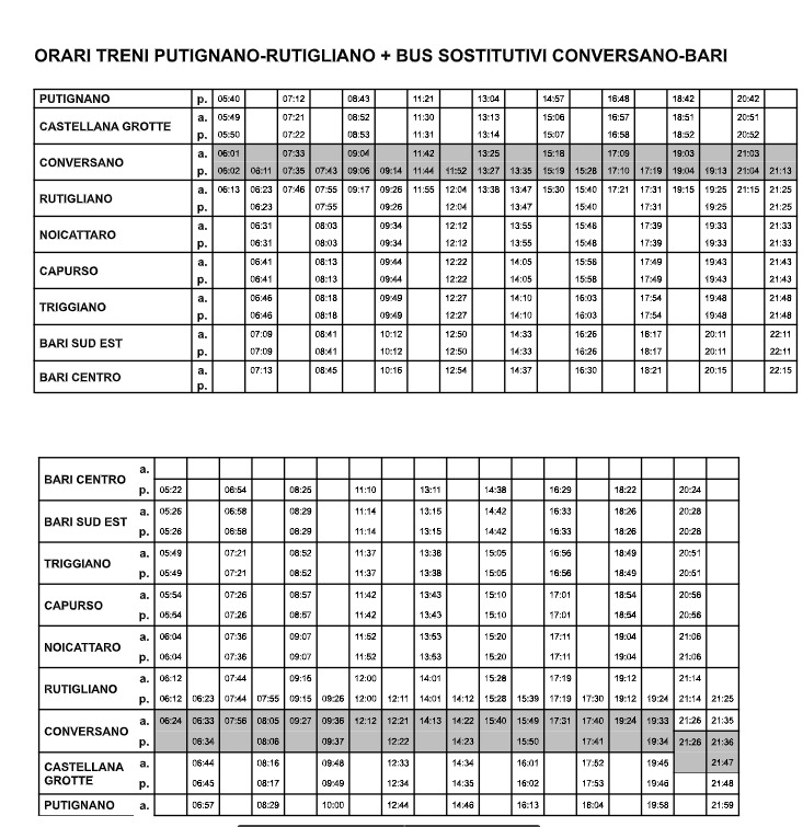 Dalla stazione di Conversano partono e arrivano i bus sostitutivi da e per Bari, in coincidenza con gli arrivi e le partenze dei treni.